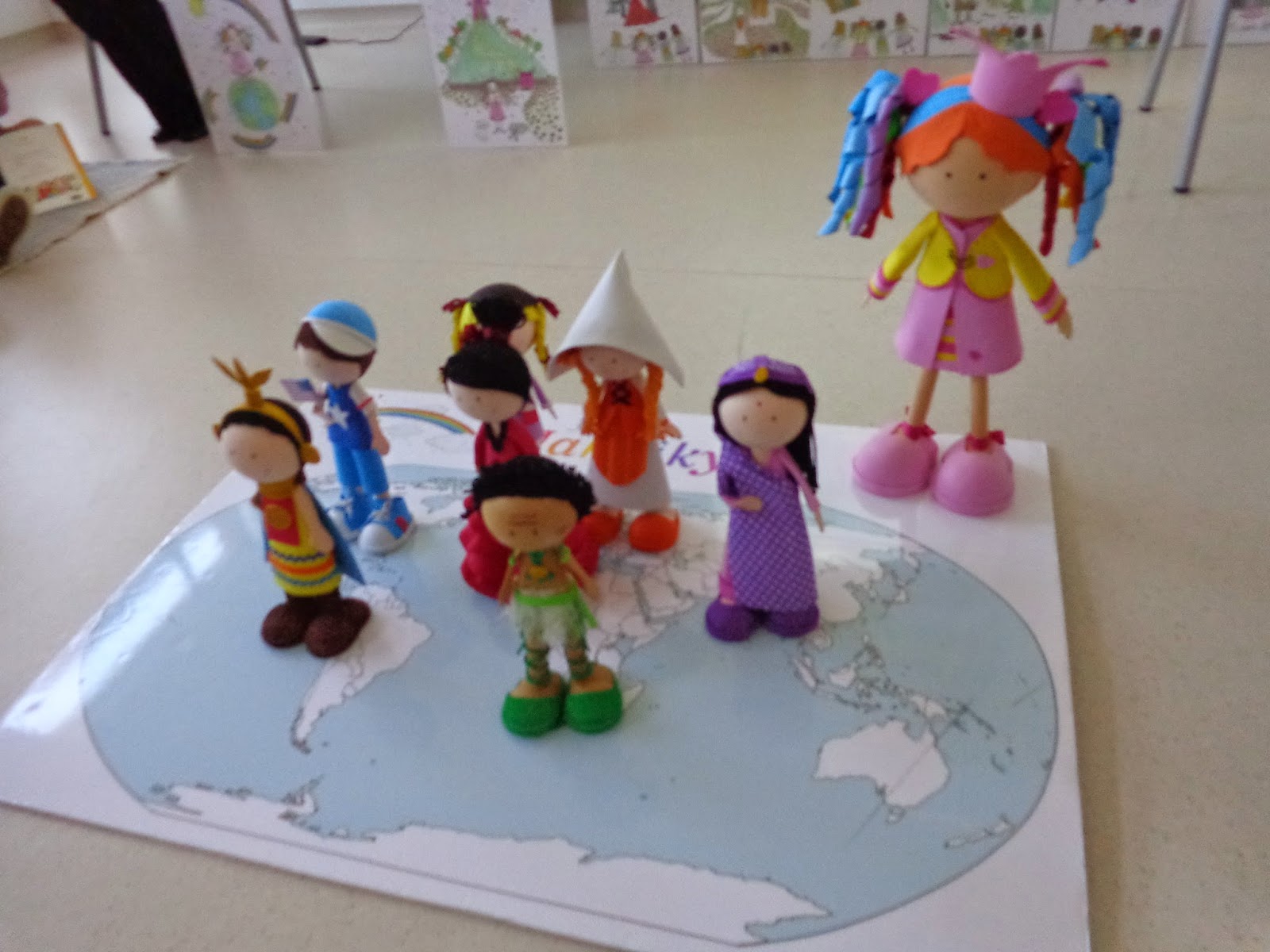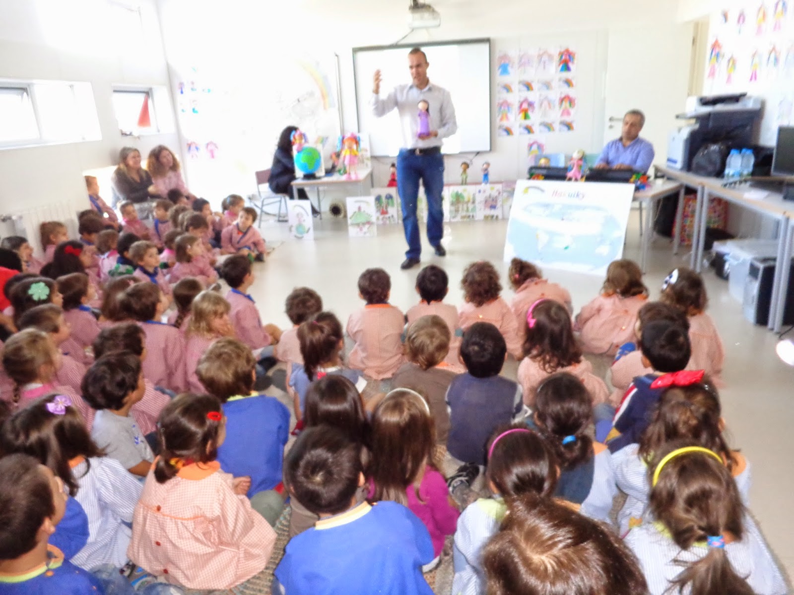 Nós já conhecíamos a história, pois já a tínhamos abordado numa das nossas rotinas diárias"hora do conto", e também tínhamos combinado entre todas as turmas, construir "bonecos articulados" a representarem os continentes por onde a Hakuiky e os amigos nos levaram. Nós escolhemos a Espanha (Sevilha)...