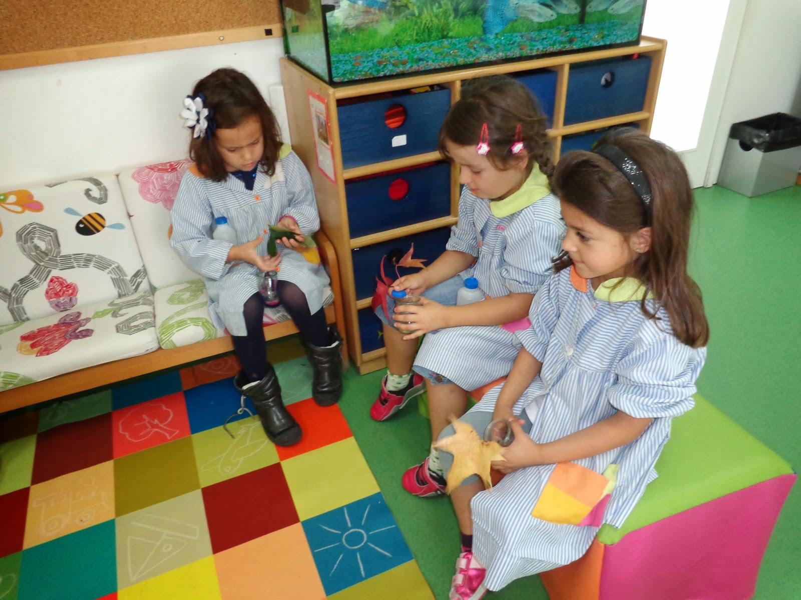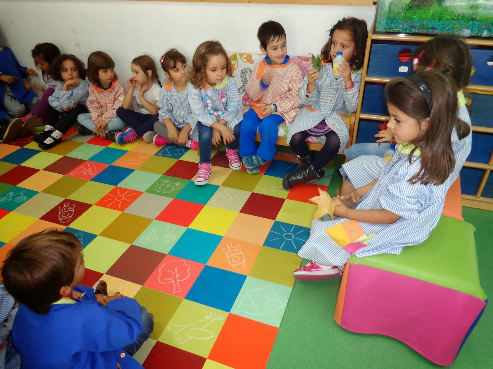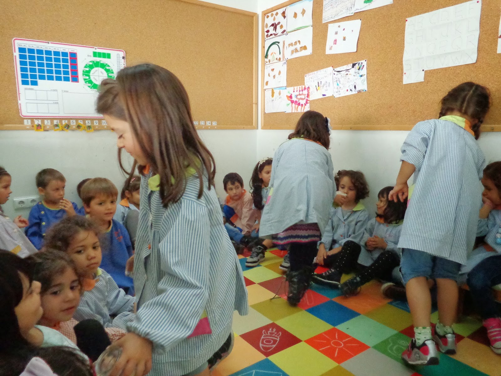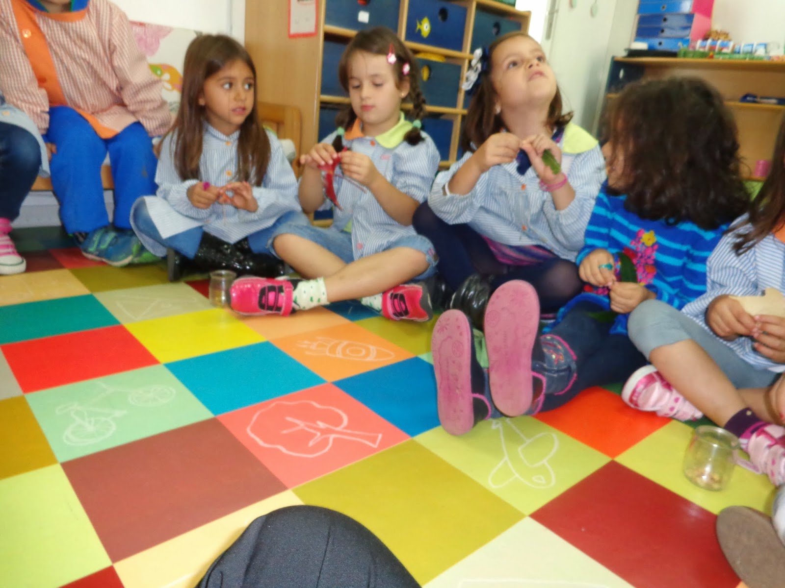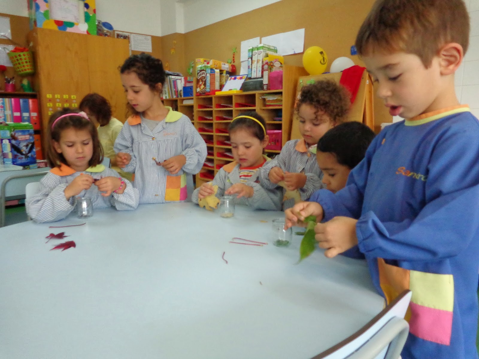 Assim foi. Dividimo-nos em 2 grupos de 3, e lá fomos. Primeiro explicamos, que as folhas que levávamos connosco (verde, vermelho e amarelo), eram de árvores de folha caduca, e quando chega o outono, perdem um pouco da sua energia, e já não conseguem alimentar as folhas, por isso é que elas mudam de cor, e depois caiem ao chão.