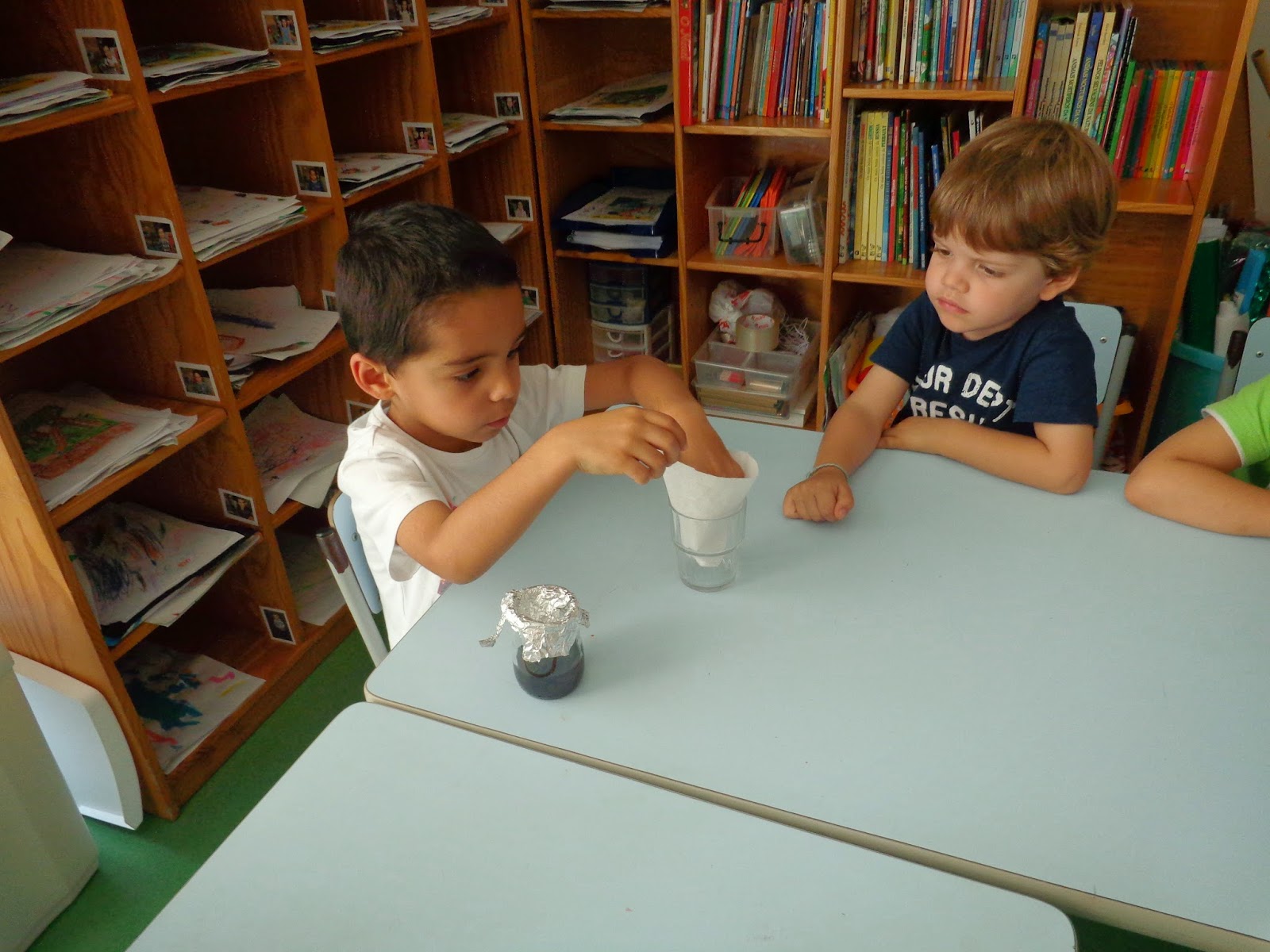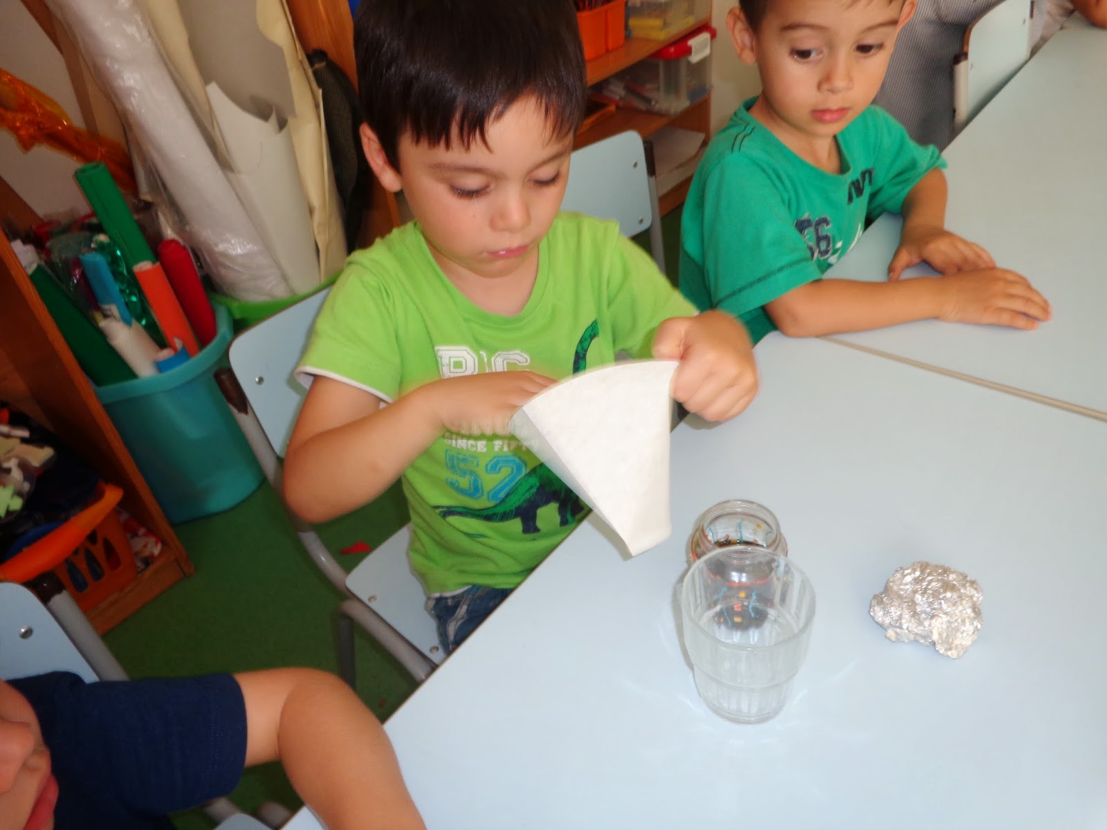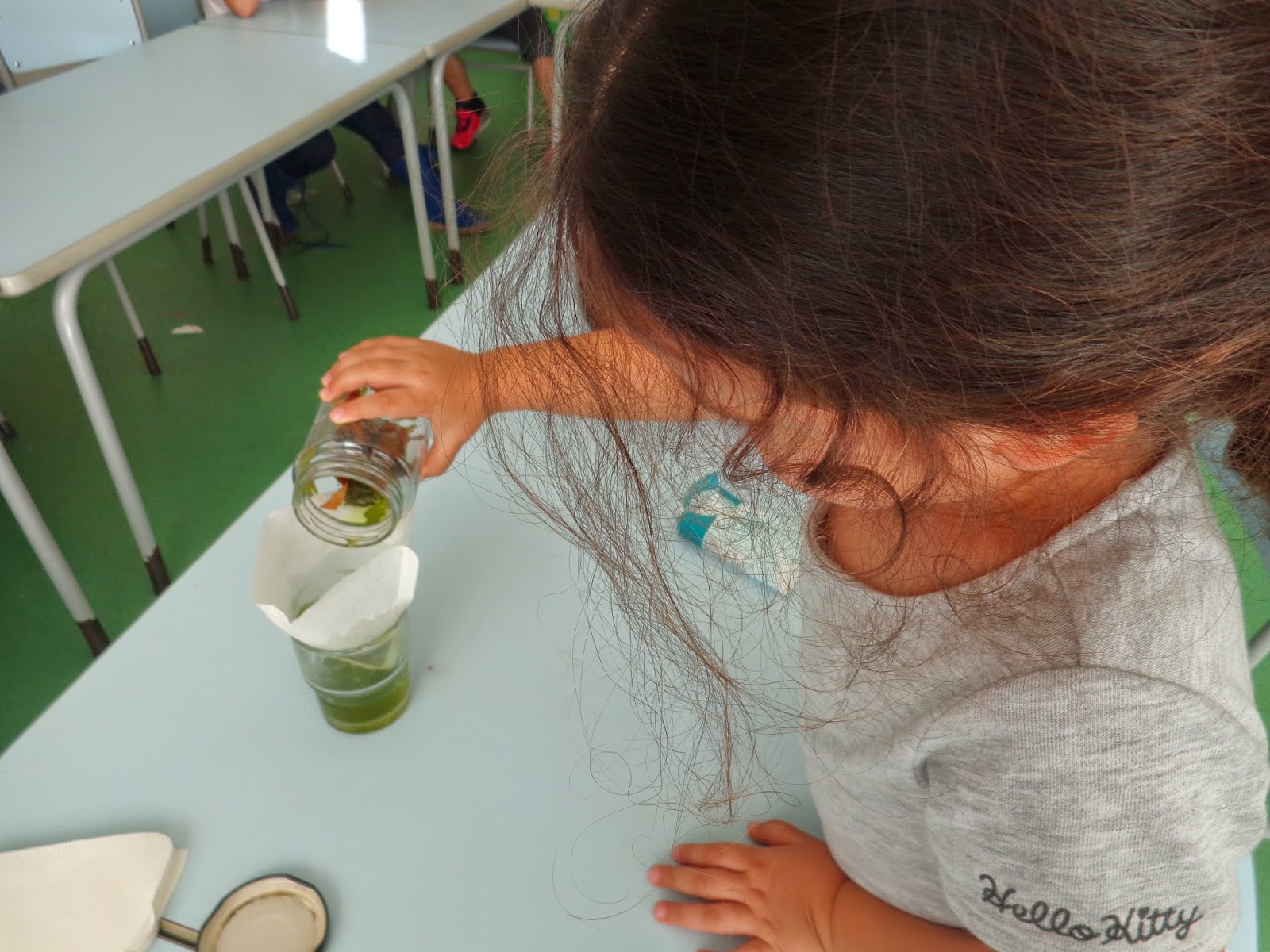 Quando achamos que já era hora de concluirmos esta experiência, pegamos nos filtros dos cafés, e colocamos dentro de 5 copos, tantos quantas as cores das folhas. Vertemos o preparado dos frascos nos filtros, e verificamos que quer no filtro, quer no copo...