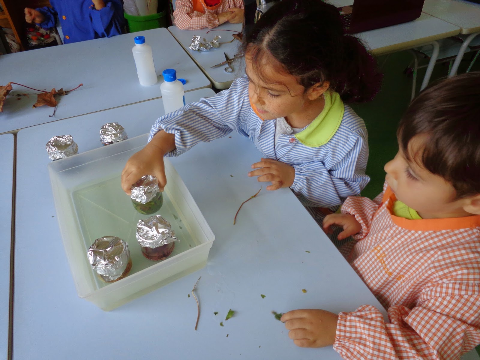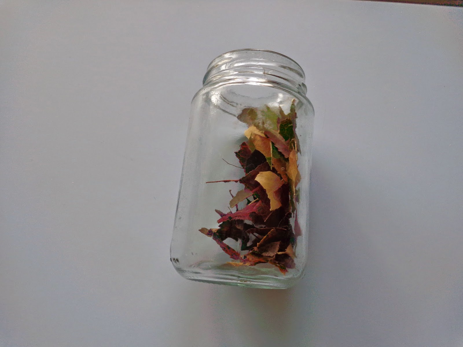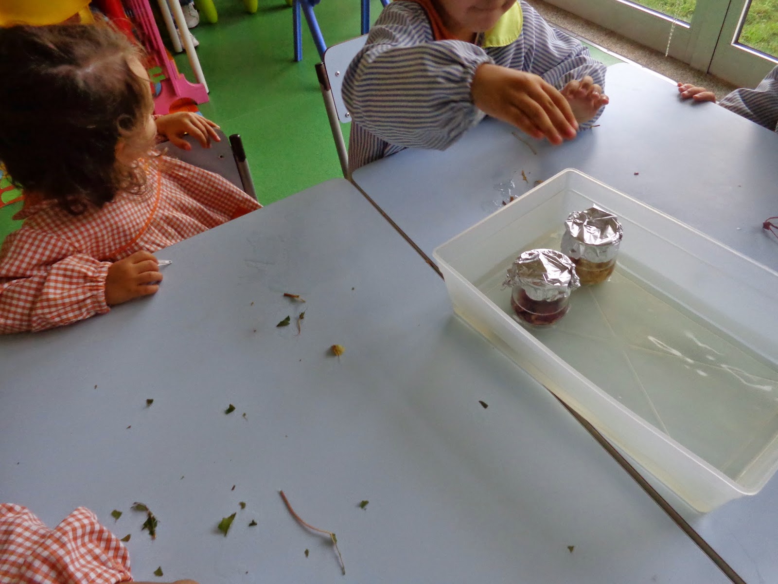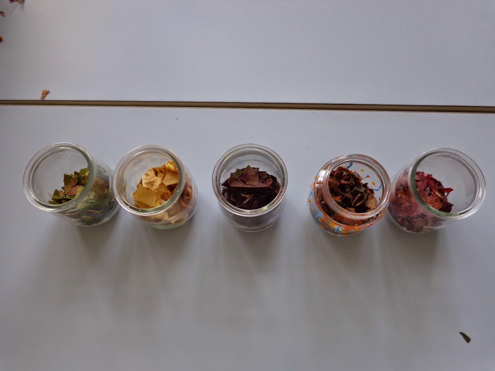 Depois metemos as folhas (de acordo com a cor) em frascos diferentes, e num outro frasco (maior) metemos folhas de várias cores.