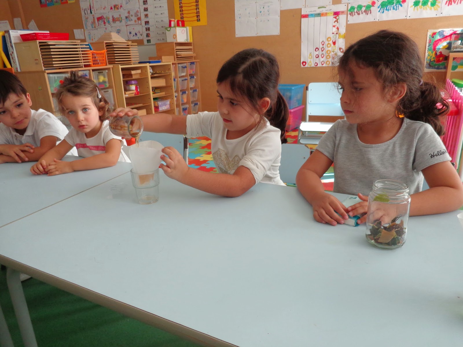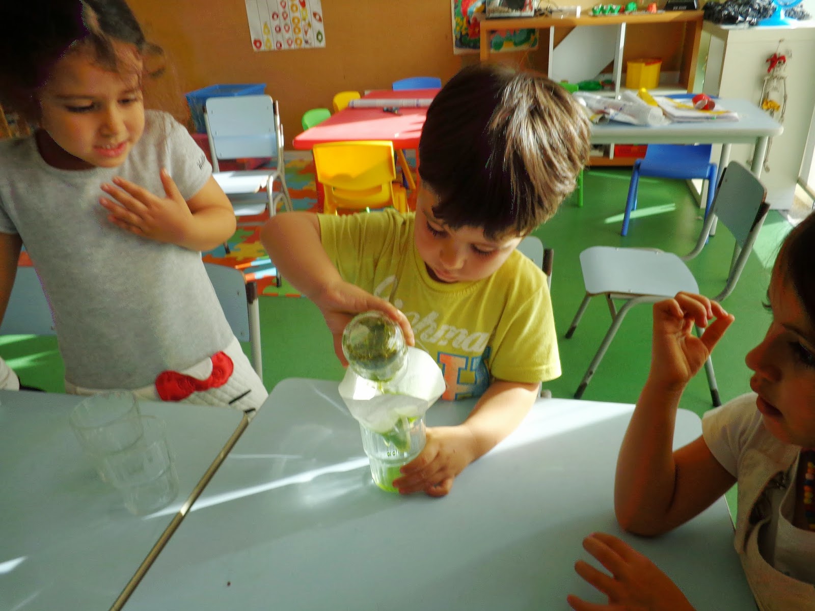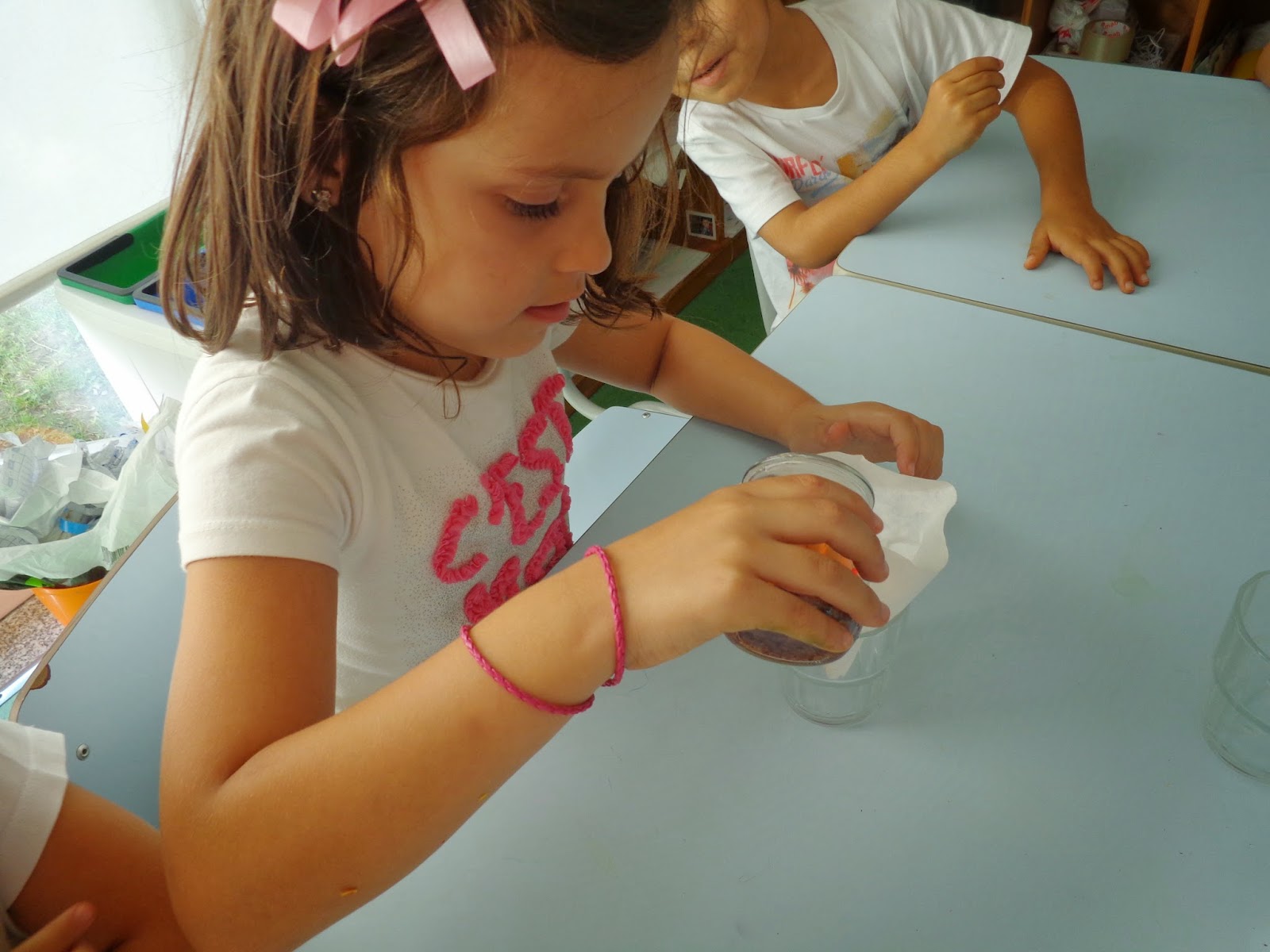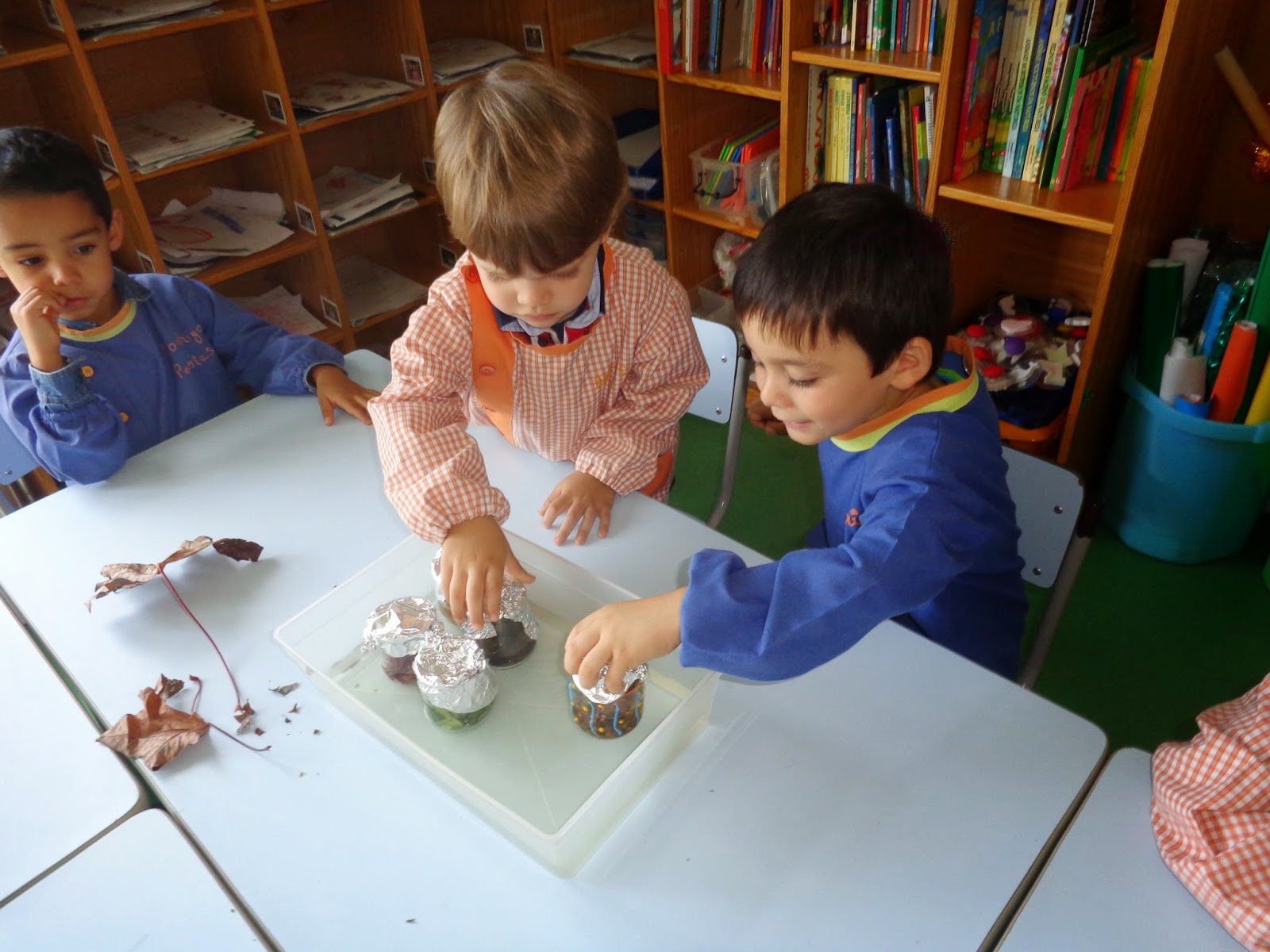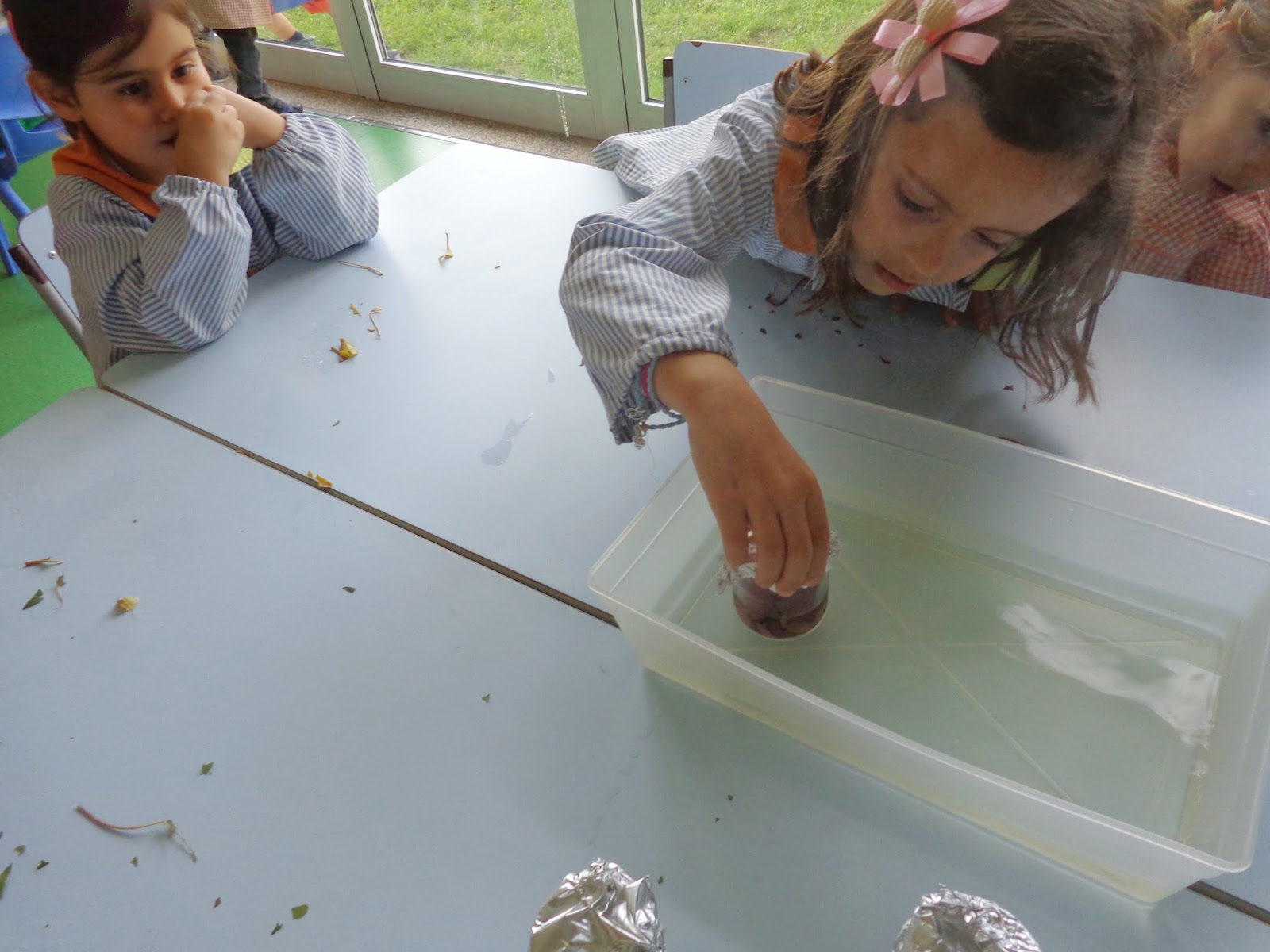 Depois metemos as folhas (de acordo com a cor) em frascos diferentes, e num outro frasco (maior) metemos folhas de várias cores.