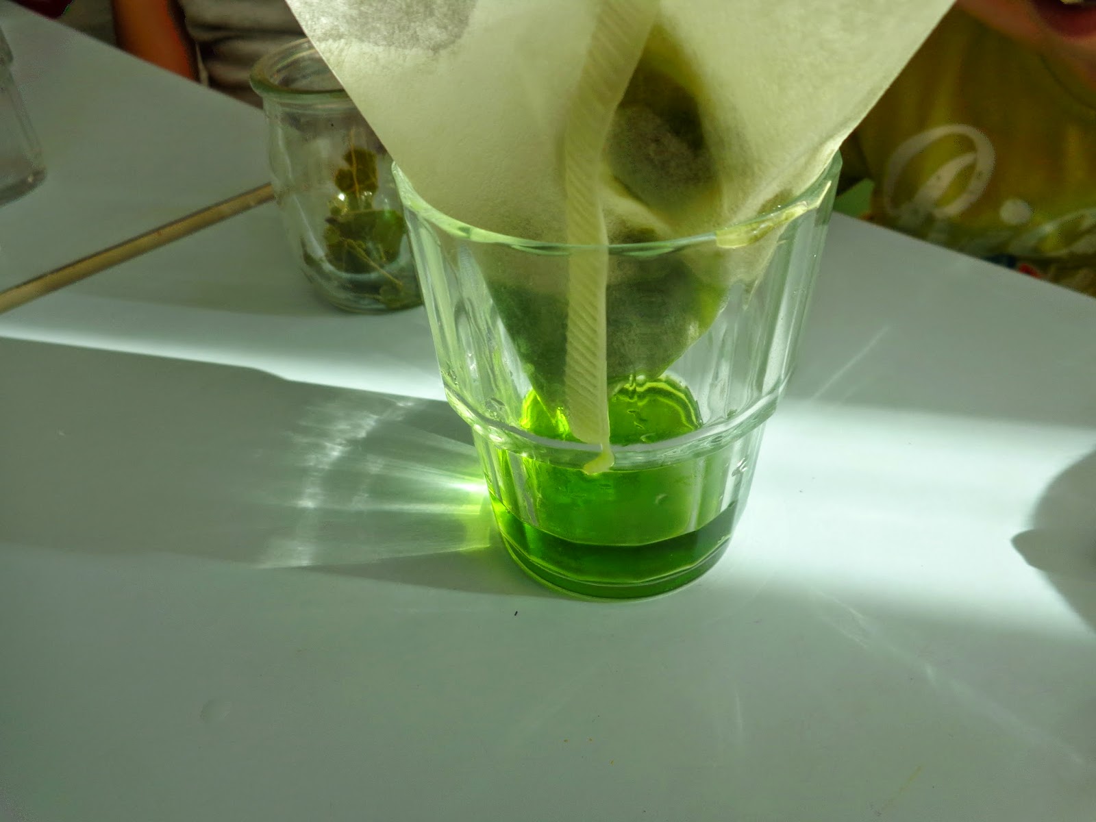 Quanto ao frasco que contém as folhas de várias cores, vamos verificar amanhã, se obtemos as cores todas ou só uma cor.