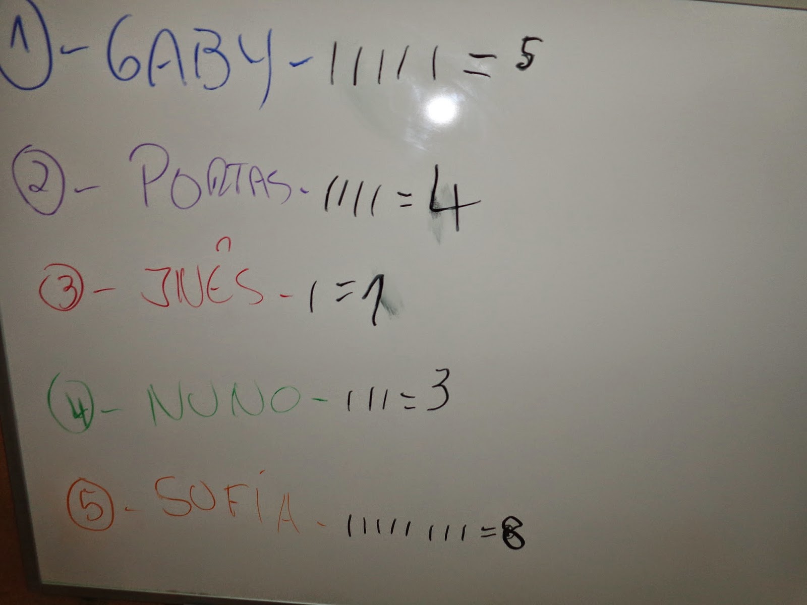 Eram 5 os candidatos, e foram eles que abriram os boletins de voto após a conclusão da votação, e que disseram o nome do votado em cada boletim de voto, para a Maria registar no nosso quadro branco.
