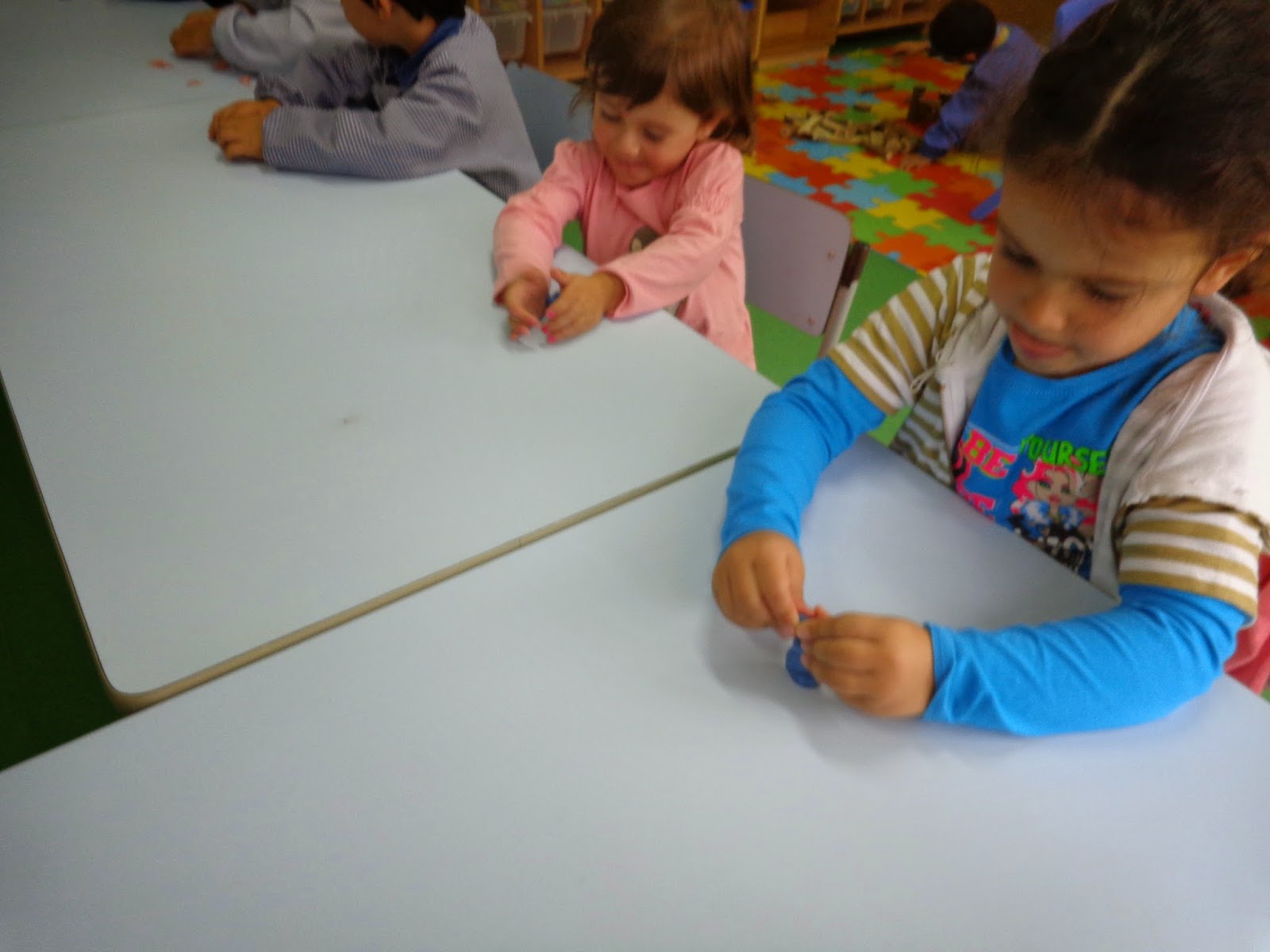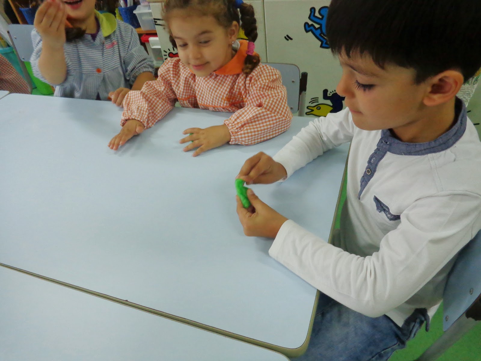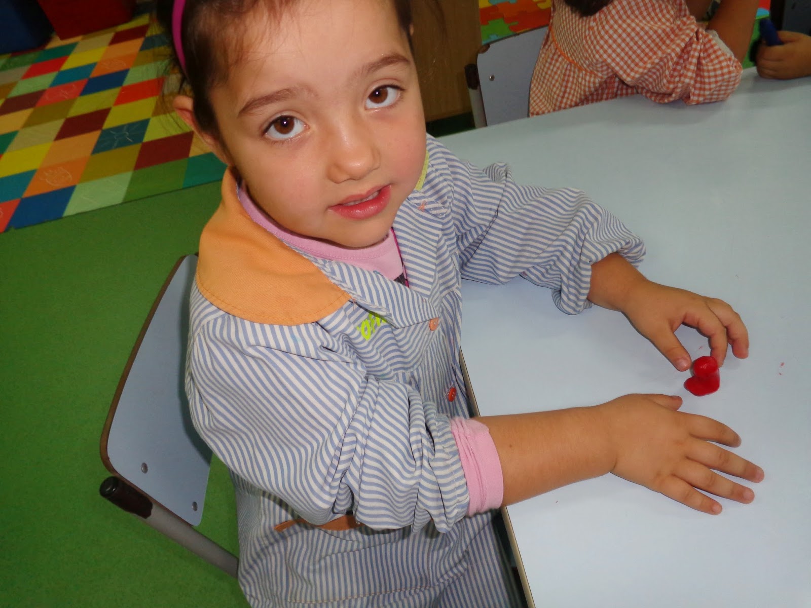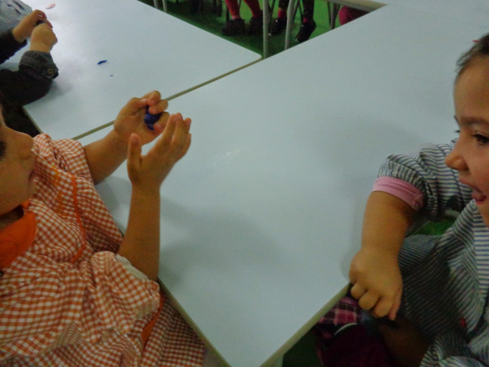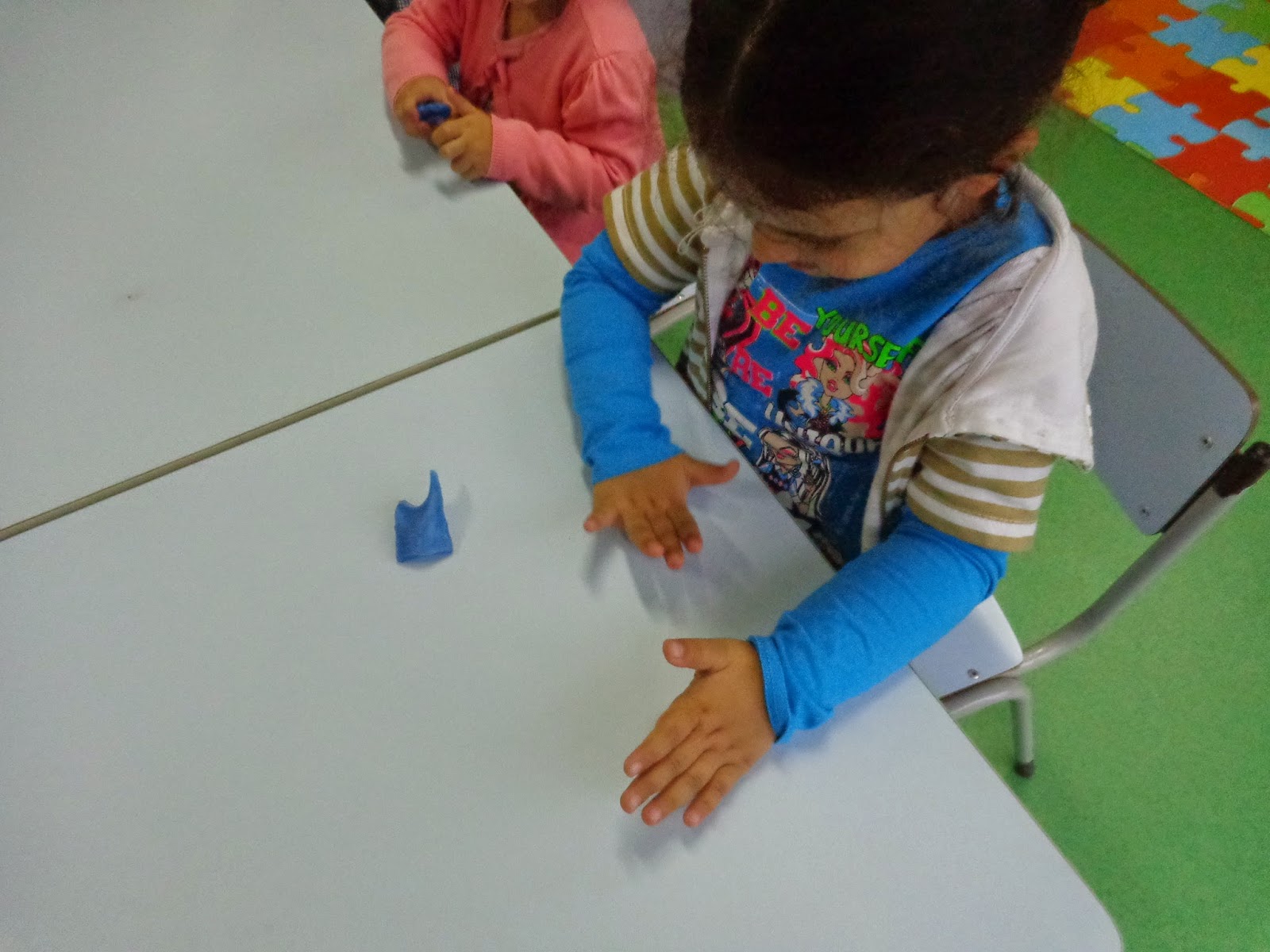 A cera que chegou à nossa sala, veio com 12 cores bem luminosas. Moldamos bocadinhos pequenos de cera ao calor da nossa mão. Este calor aumentou à medida que fomos explorando a cera, trabalhando assim a motricidade fina.