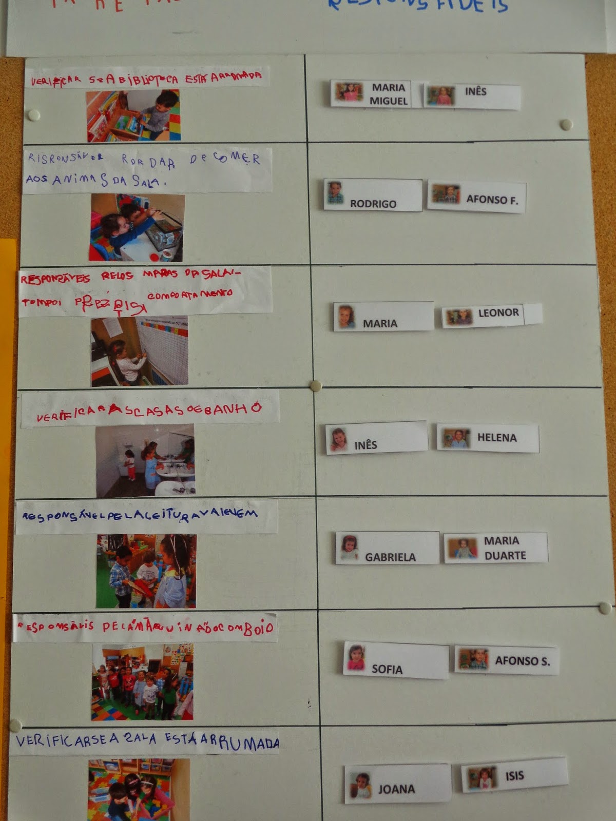 grande grupo analisamos o quadro do ano passado, e decidimos que o novo teria fotografias nossas em ação nas tarefas de sala, a figurarem no quadro de tarefas. Estas tarefas vão ser concretizadas a pares.