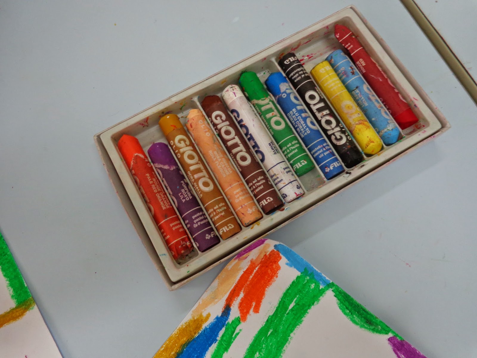 Vimos que este pintor, fazia pinturas abstratas, e que usava muitas cores. Cores quentes e frias, cores primárias e secundárias. Inspirados nestas obras começamos por elaborar uma das partes da caixa, utilizando giz pastel.