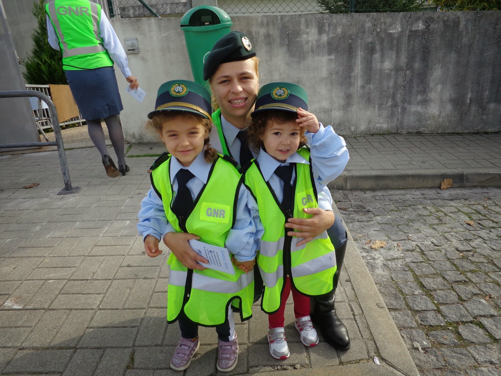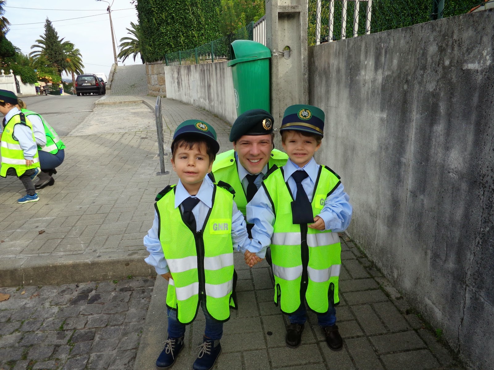 Depois de ouvirmos atentamente as explicações, vestimos as fardas da GNR, e fomos para a rua, como uns autênticos agentes, para alertar os condutores para os procedimentos adequados à circulação rodoviária. Para tal entregamos folhetos informativos.