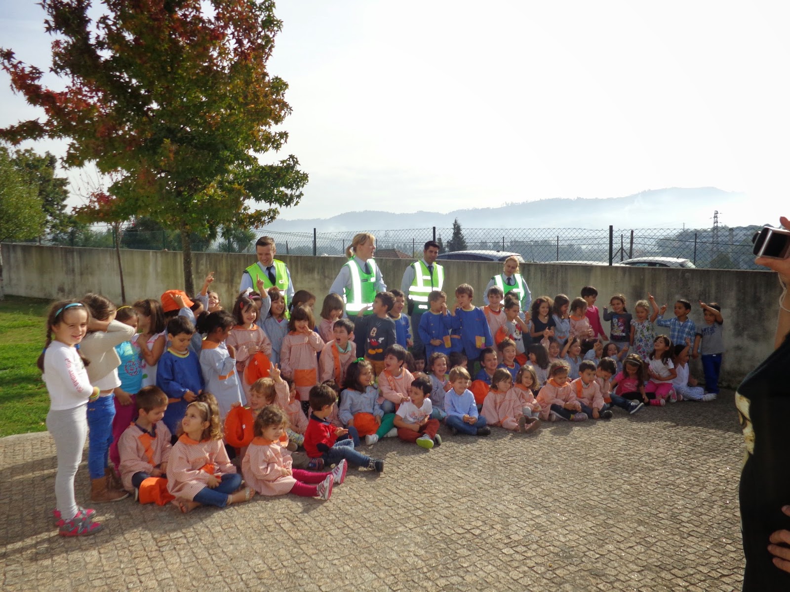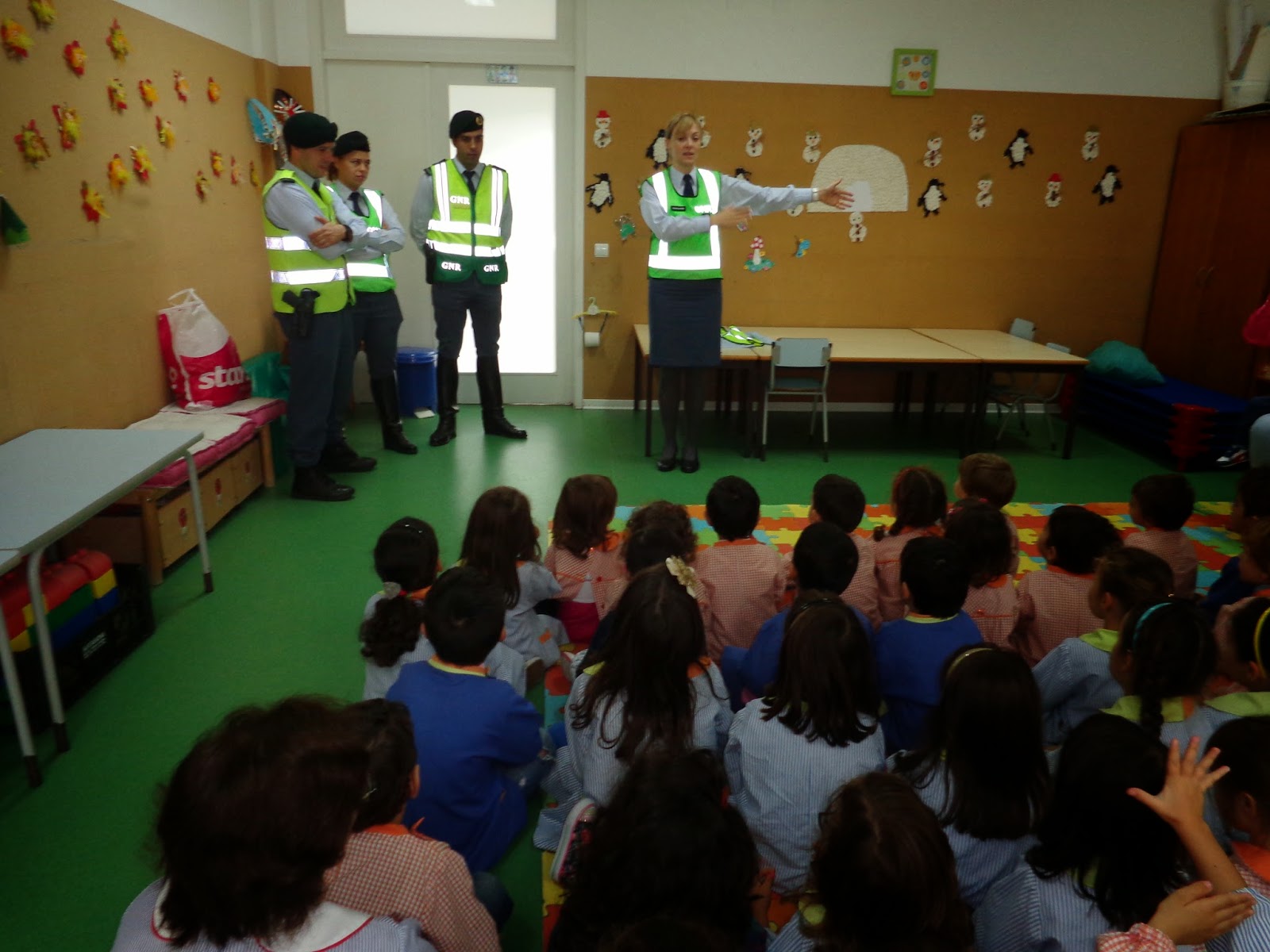 Primeiro recebemos a visita de 4 agentes da GNR, que nos falaram das regras básicas de circulação rodoviária. Explicaram como se deveria fazer para fiscalizar os automóveis, que era o que iríamos fazer de seguida.