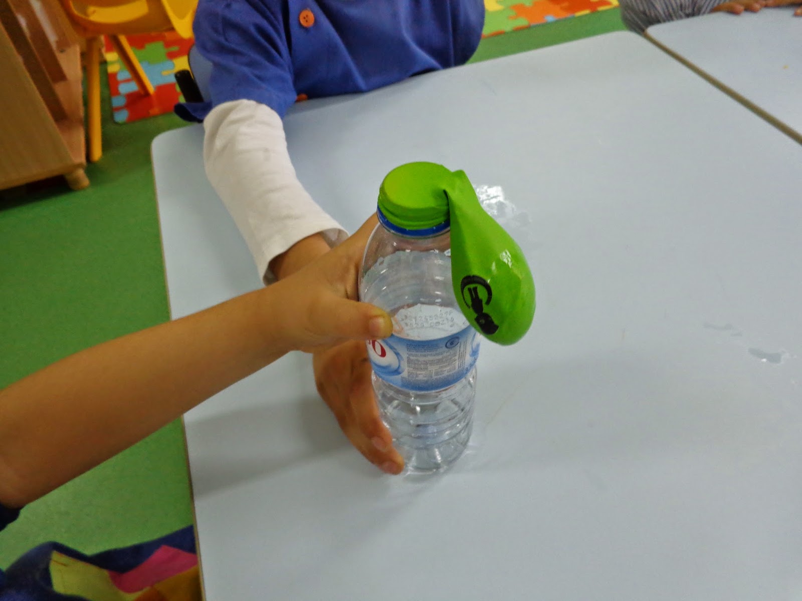 O balão verde encheu pouco, o cor de rosa encheu bastante, o balão branco não encheu nada ... e o balão azul? Que aconteceu ao balão azul? Pois é ...encheu tanto, que voou. É verdade...voou por cima da cabeça da Joana e da professora, e molhou-lhes o cabelo de vinagre. "Foi muito fixe". Por esta não esperávamos...Não estava no programa, mas que foi engraçado, foi!