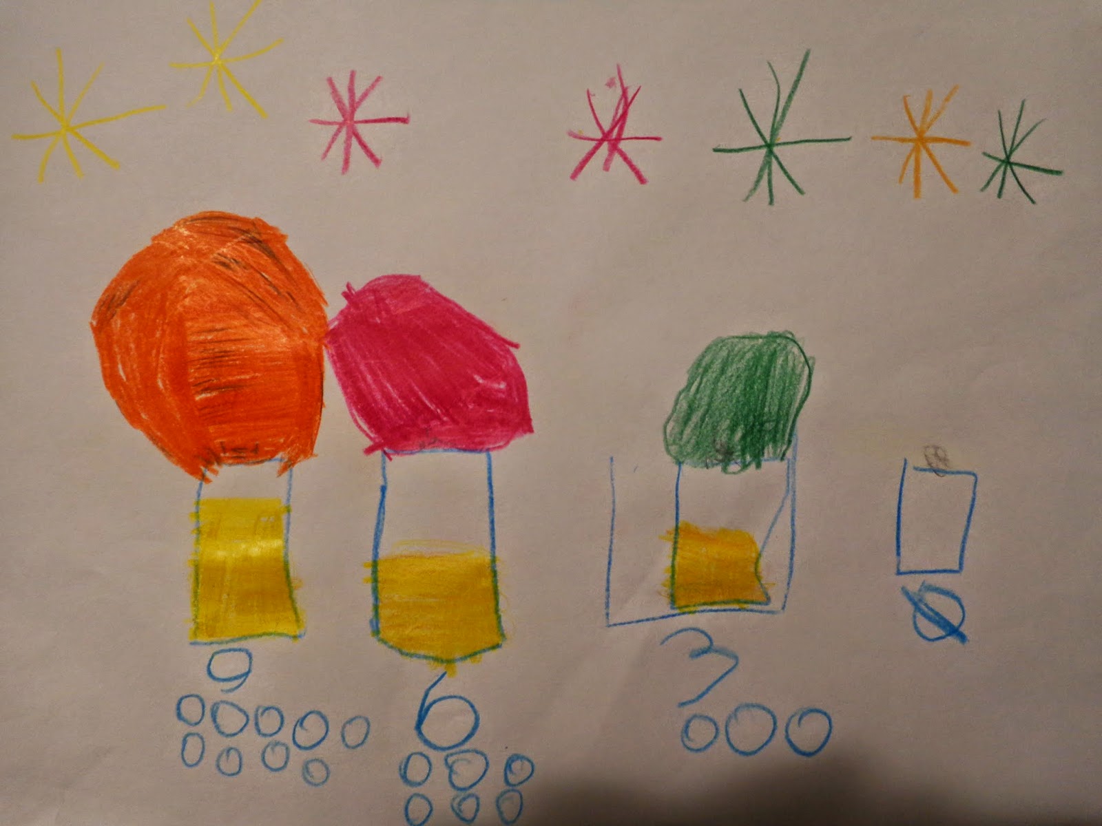 Concluímos que o balão branco não encheu, porque não tinha vinagre, que o balão verde só encheu um bocadinho porque a garrafa só levou 3 tampas de vinagre, que o balão vermelho encheu mais que o verde, porque a garrafa levou 6 tampas de vinagre, e o balão laranja encheu mais ainda, porque a garrafa levou 9 tampas de vinagre. Por isso é que quando fizemos os "fantasminhas", uns encheram mais que outros. Tudo dependeu da quantidade de vinagre que colocamos nas garrafas.
