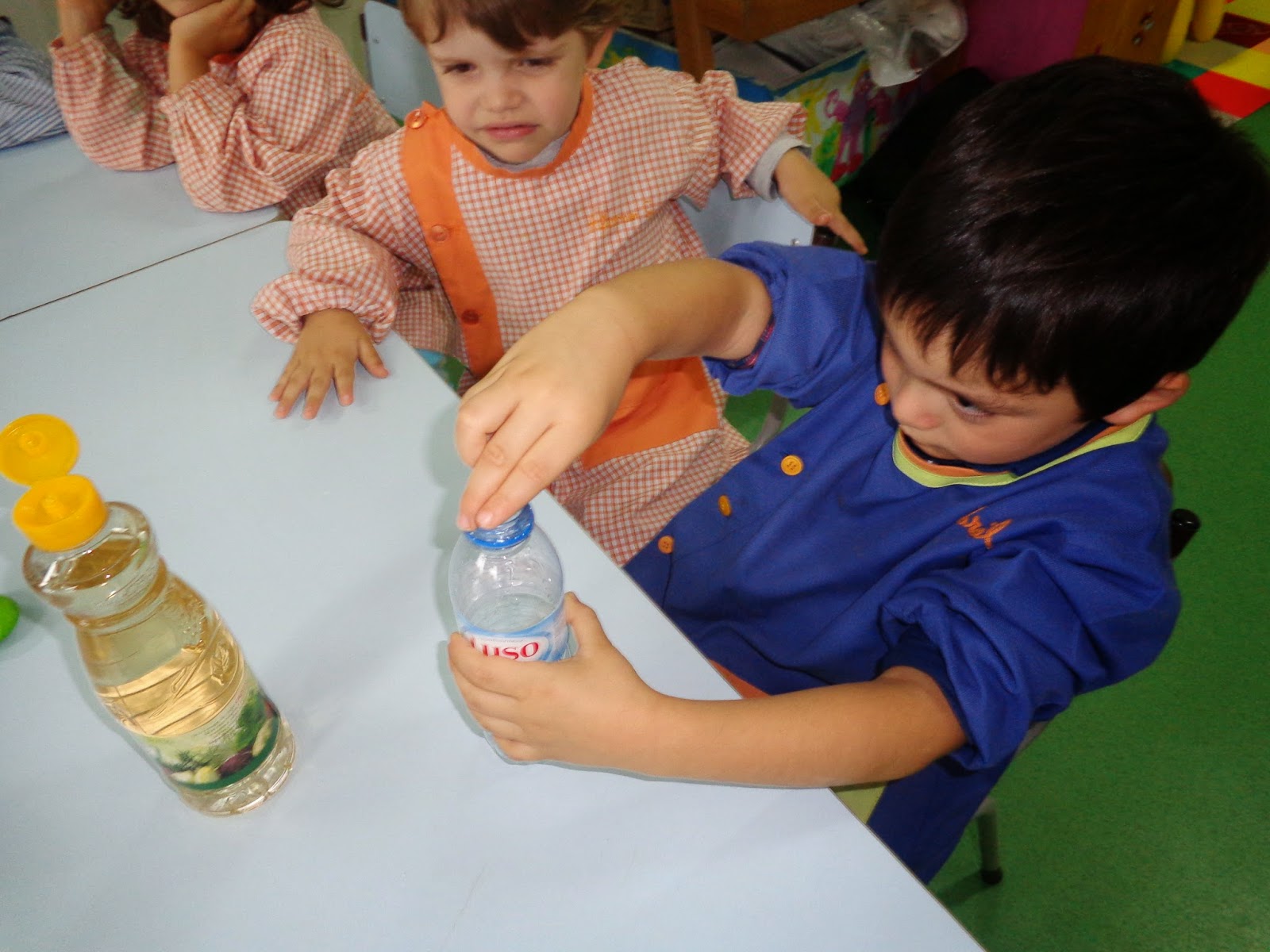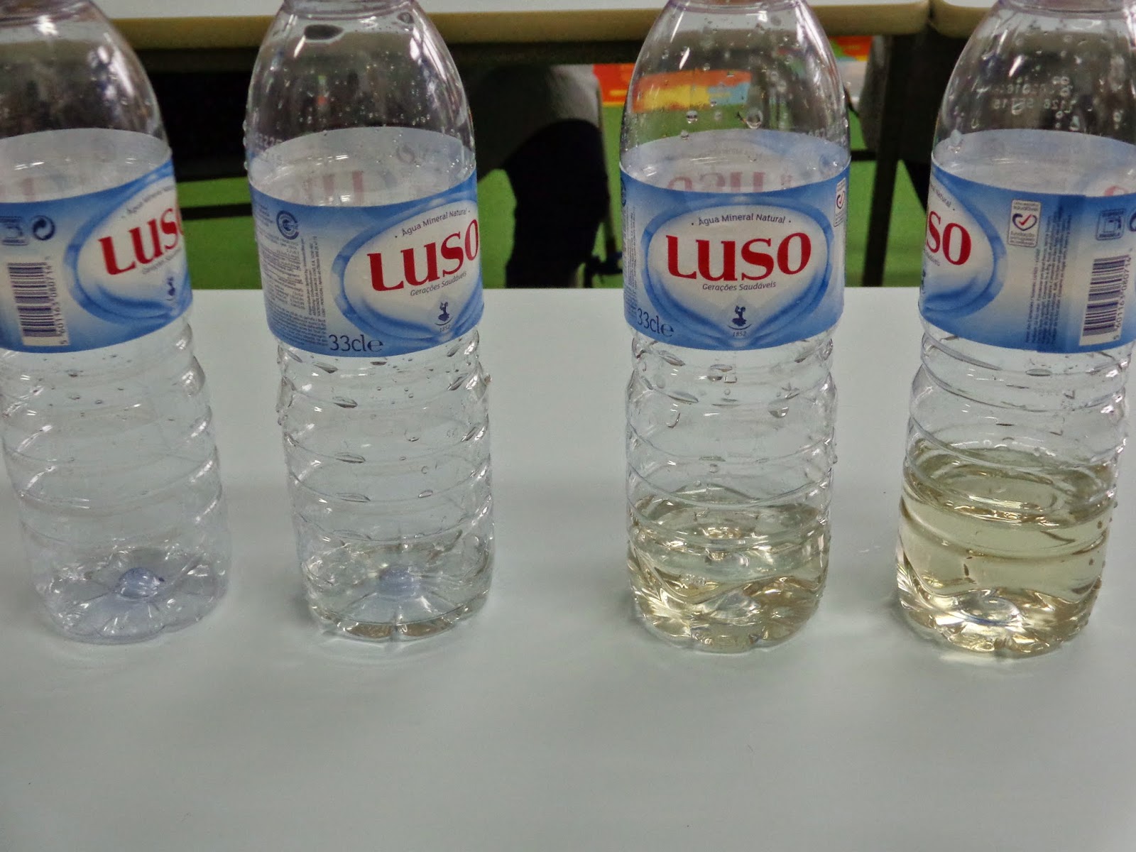 Numa garrafa não colocamos vinagre. Noutra colocamos 3 tampas de vinagre; noutra 6 tampas de vinagre e na última 9 tampas de vinagre.