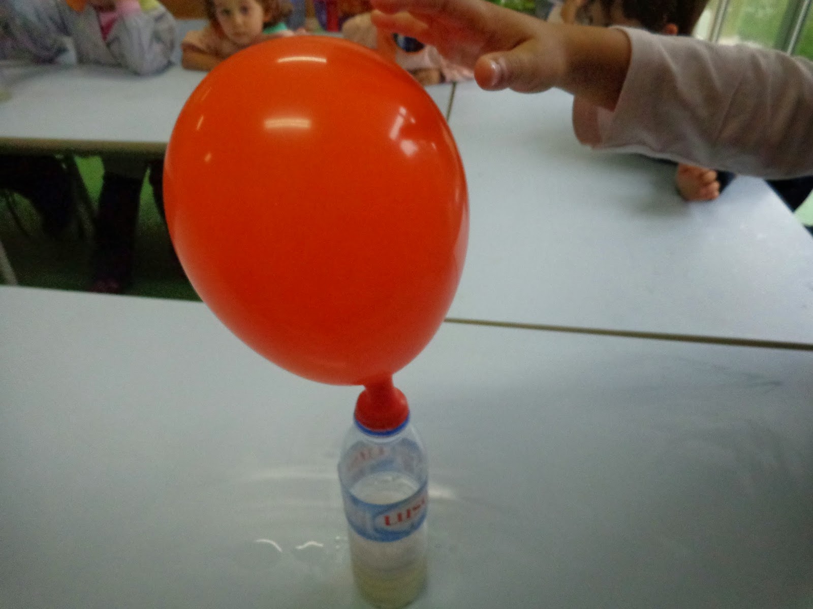 Então, para podermos concluir a experiência, substituímos o balão azul por um laranja, e ... vejam como este encheu!