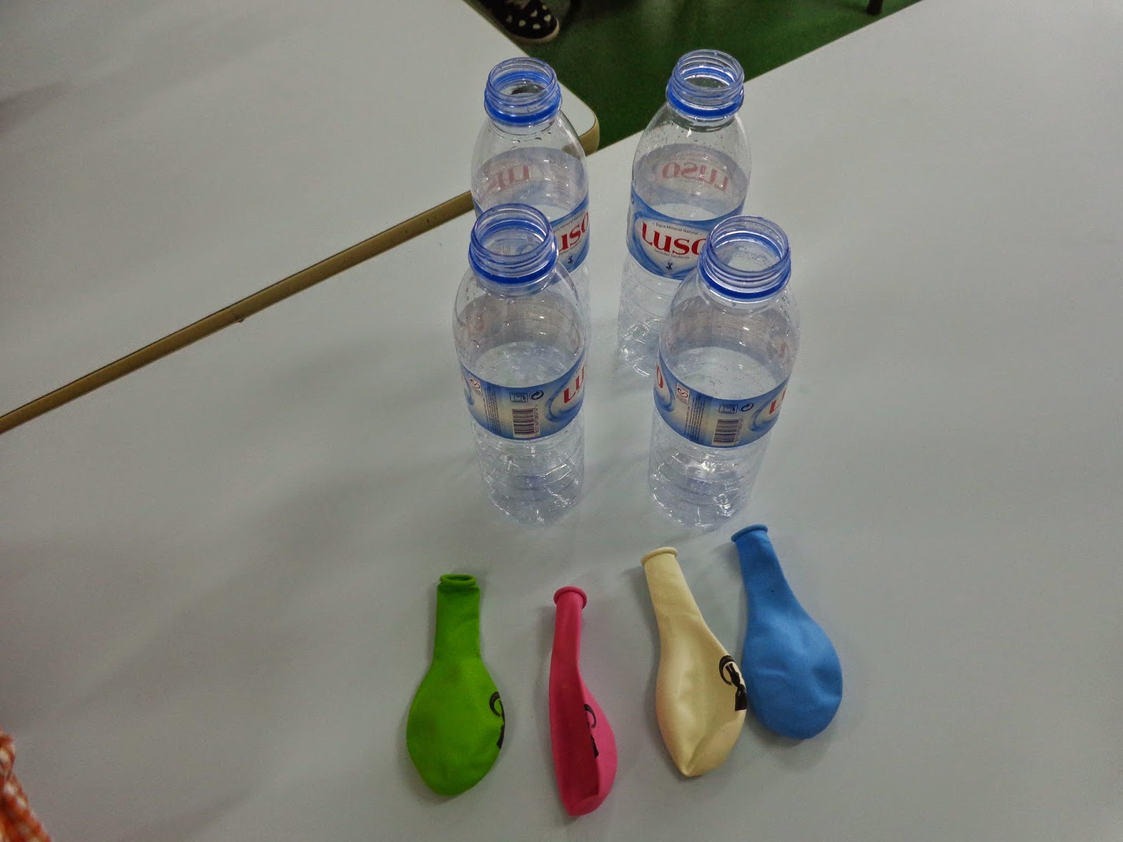 Nessa altura não tivemos tempo de procurar as respostas para estas questões. Hoje voltamos a elas, e repetimos a experiência. Colocamos 4 garrafas e 4 balões de cores diferentes.