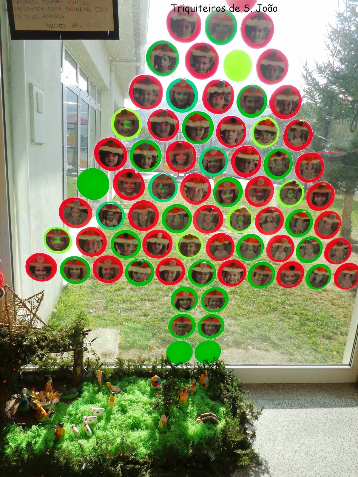 Falemos primeiro da árvore... Fomos ver a árvore (com círculos verdes e vermelhos, que ficaram do ano passado) e que está na janela frontal da escola, e concluímos todos (as 3 salas) que iríamos manter essa árvore, mas decoraríamos de forma diferente do ano passado.
