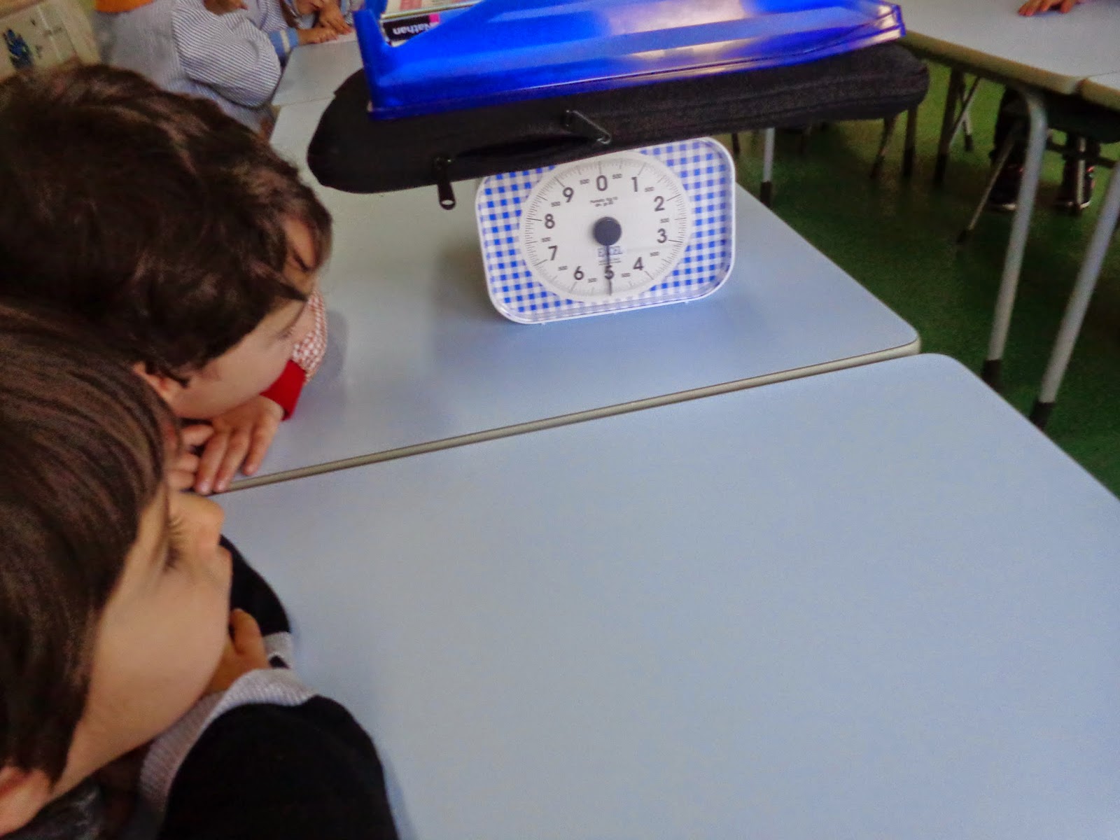 Então precisávamos de uma balança de cozinha, para fazermos a experiência da pesagem (5 Kgs). E foi essa balança que estivemos a verificar...Vimos que tem números que vão do zero o nove, que tem uma "seta" no centro, que tem "muitos 500" (Leonor). Estes "500" serão motivo de novas experiências, assim que pudermos.