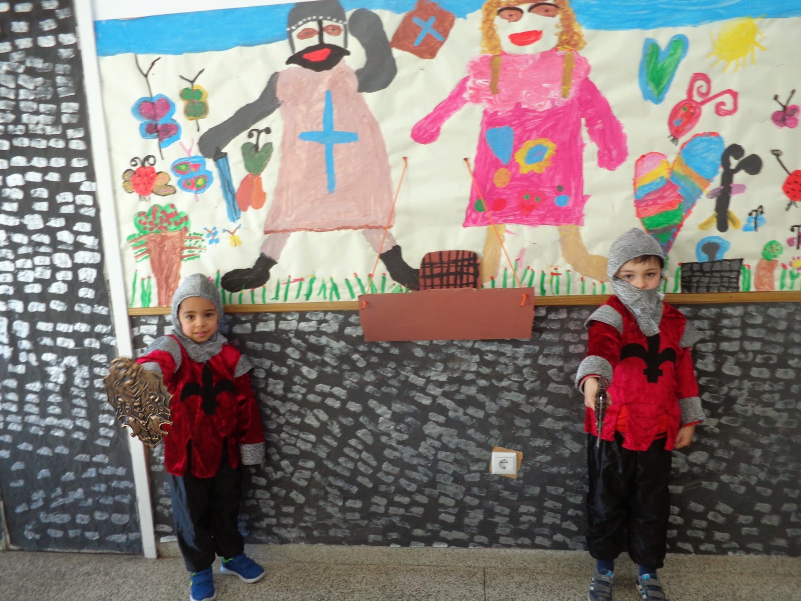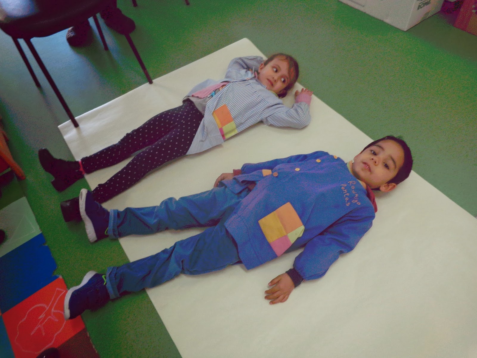Decidimos que o mural iria ter o D. Afonso Henriques e a Dona Mafalda, a passear/namorar no jardim real. Decidimos ainda que as personagens principais, iriam ser desenhadas com o contorno dos nossos corpos.
